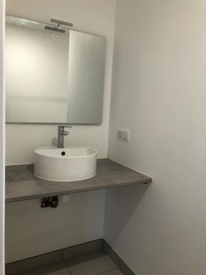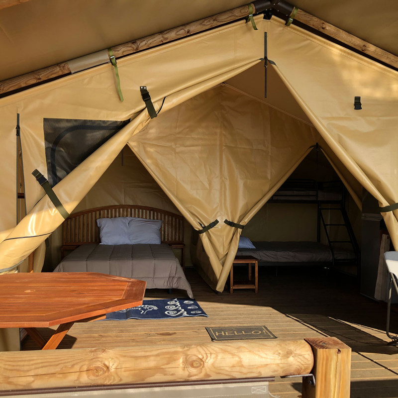 Furnished lodge connected to water and electricity with equipped kitchenette (fridge-freezer, gas hob, microwave), table, chairs, beds, and dishes.